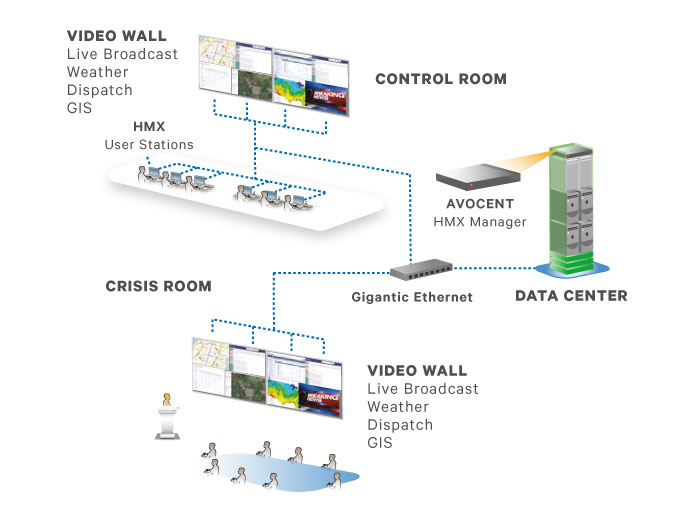 The Avocent HMX Digital High Performance KVM system is designed for organizations that need to provide workers the ability to seamlessly access and share one or more computing resource(s) which are physically separated from their work environment. This solution provides users an “at-the-desktop” experience from their work stations to any appliances, PCs or computing resources attached to the HMX IP network
