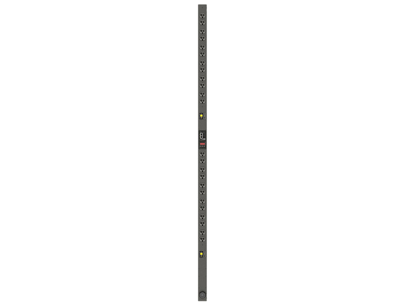 Unit Level Monitored Rack PDU VP4N30AP is a 30A, 120V 0U vertical with input power monitoring. It has 24 NEMA 5-20R receptacles and a NEMA L5-30P providing 2.8 kW of power capacity. The unit is equipped with an environmental sensor port and dual ethernet ports to simplify management of multiple rPDUs with fault-tolerant daisy chaining or IP aggregation capabilities.