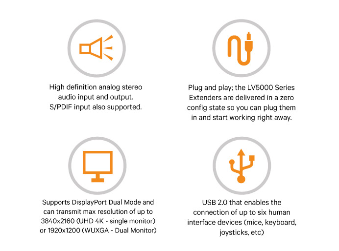 The LV 5000 series support DisplayPort Dual Mode video and offers pixel-perfect video resolutions for demanding applications. Users can choose to have a maximum resolution of 3840x2160 (UHD 4K) with a single monitor or 1920 x 1200 (WUXGA) resolution in a dual monitor configuration. Picture quality is delivered through an uncompressed system whereby every pixel of every frame is sent without loss.