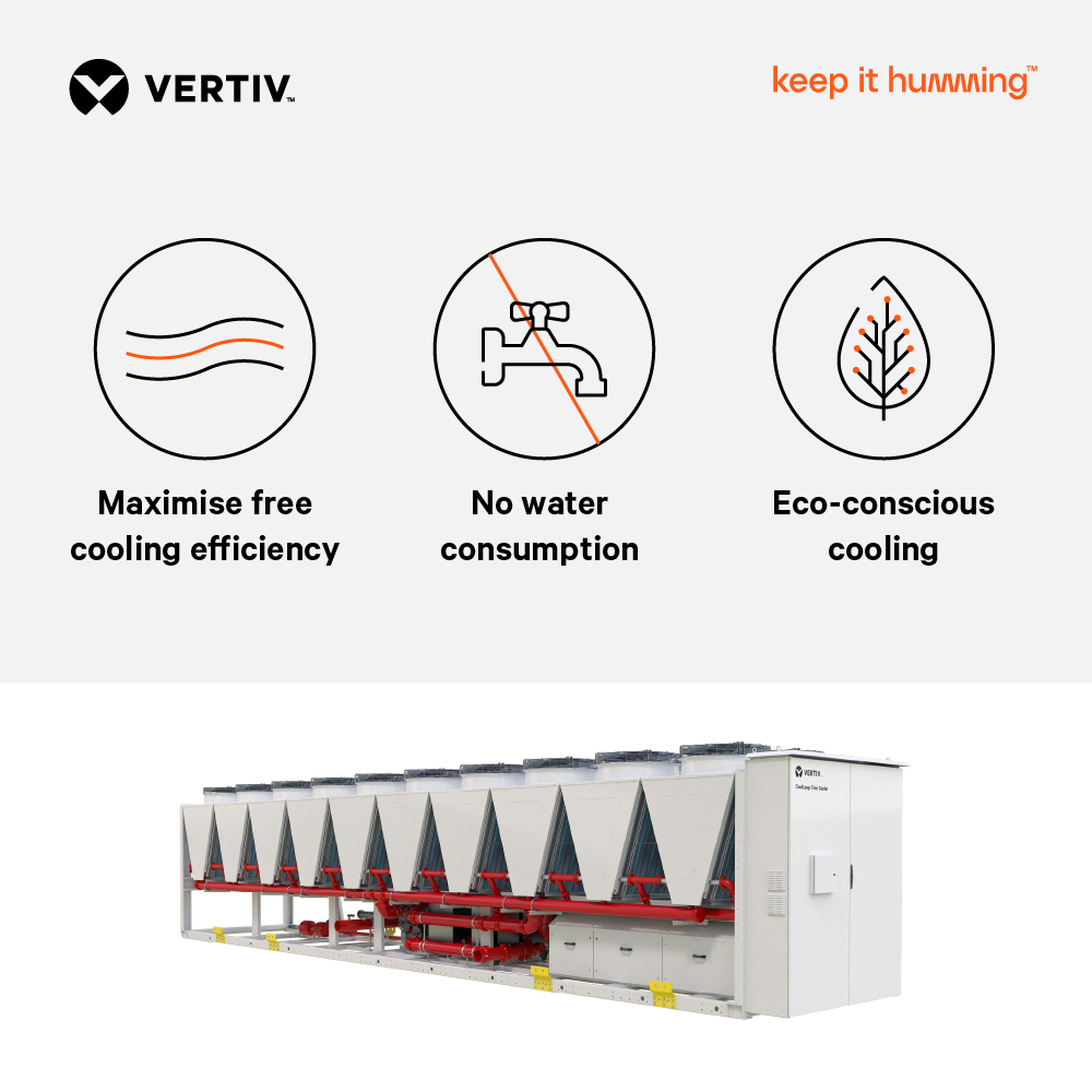 • ZERO WATER WASTE: The Vertiv™ CoolLoop Trim Cooler is a fully dry solution that reduces water waste and operational complexity by removing the need for water supplies or treatment infrastructure.