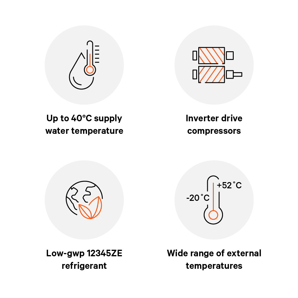 • ENVIRONMENTAL RESPONSIBILITY: When ambient temperatures rise, very low-GWP refrigerant R1234ze compressors manage peak loads without compromising operational efficiency, while maintaining full compliance with environmental targets.
