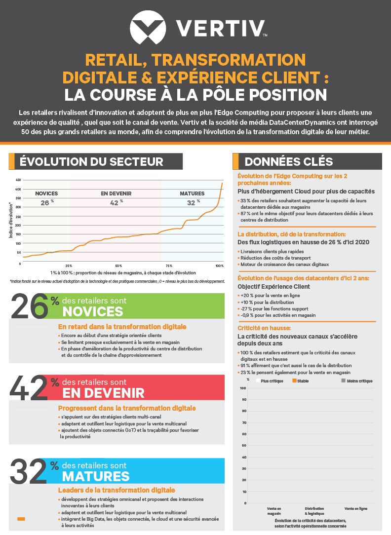 Téléchargez le rapport| Près de 90 % des retailers du Fortune 500 se tournent vers Vertiv pour protéger les technologies qui alimentent leur expérience client. Découvrez comment nous pouvons vous aider. |