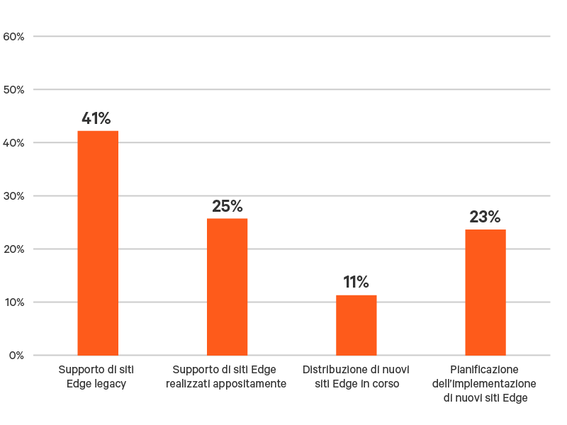 I partecipanti delle aree EMEA e India sono i più propensi a supportare siti edge legacy; circa la metà dell’attività sull’edge in queste due regioni (49% e 50%, rispettivamente) avviene in siti legacy. Per le altre regioni, il 37% dei partecipanti ha dichiarato di supportare siti edge legacy.