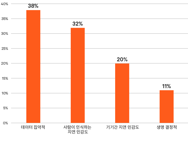 - 기기간 지연 민감도 활용 사례는 일반적으로 사람이 인식하는 지연 민감도 활용 사례보다 훨씬 더 짧은 대기 시간을 요구합니다. 기계가 사람보다 데이터를 더 빠르게 처리하기 때문입니다. 이 범주의 주요 활용 사례에는 스마트 그리드와 스마트 보안 시스템 등이 있으며, 응답자 5명 중 1명(20%)이 기기간 지연 민감도 활용 사례를 자사의 엣지 투자의 동인으로 꼽았습니다.