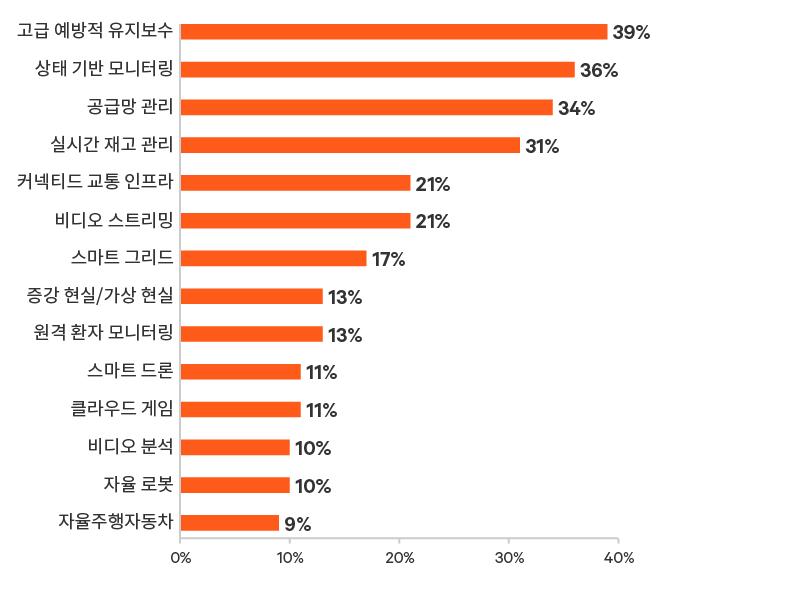 제조 장비의 다운타임 감소와 공급망 최적화가 엣지 투자를 주도하는 가장 보편적인 활용 사례였습니다. 응답자들은 예방적 유지보수 관련 활용 사례를 가장 많이 꼽았고(39%), 그 다음으로는 상태 기반 유지보수(36%), 공급망 관리(34%), 실시간 재고 관리(31%) 순이었습니다(그림 8).